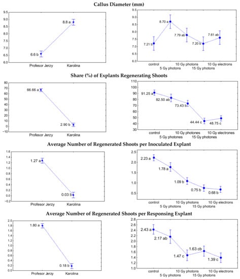 The effect of genotype (left plots) and dose and type of irradiation with high-energy photons and electrons (right plots) on the in vitro regeneration characteristics of chrysanthemum explants after 12 weeks of induction step (for callus diameter) followed by 18 weeks of regeneration step. In case of irradiation type and dose impact on the callus diameter it was calculated for both studied cultivars (‘Profesor Jerzy’ and ‘Karolina’) while share of explants regenerating shoots and average numbers of regenerated shoots were calculated exclusively for ‘Profesor Jerzy’. Means followed by the same letter do not differ significantly at p ≤ 0.05, whiskers indicate SE.