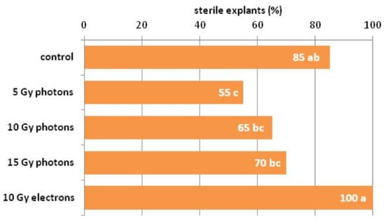 An effect of irradiation with different doses of high-energy photons and electrons on the share of sterile chrysanthemum explants. Data followed with the same letter do not differ significantly at p ≤ 0.05.