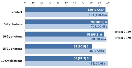 Interestingly, the impact of irradiation treatments on the sterility of the explants was noticed and statistically proved (Figure 5). It can be stated, that with growing dose of irradiation, the percentage of sterile explants increased (gradually, from 55% in 5 Gy photons to 70% in 15 Gy photons), and the highest (full) sterility was achieved for 10 Gy high-energy electrons treated ovaries (comparably with the control).