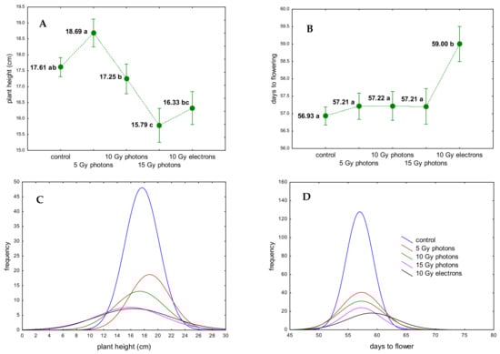 Effect of dose and type of irradiation with high-energy photons and electrons on subsequent in vivo growth and flowering of chrysanthemum ‘Profesor Jerzy’ plants originated in vitro from irradiated ovaries (first season, year 2019): plant height (cm) (A,C) and flowering time expressed as number of days required to full blossom (B,D). For (A,B): means followed by the same letter do not differ significantly at p ≤ 0.05, whiskers indicate SE. For (C,D): density plots were calculated according to normal distributions on the base of real frequency of observed individuals.
