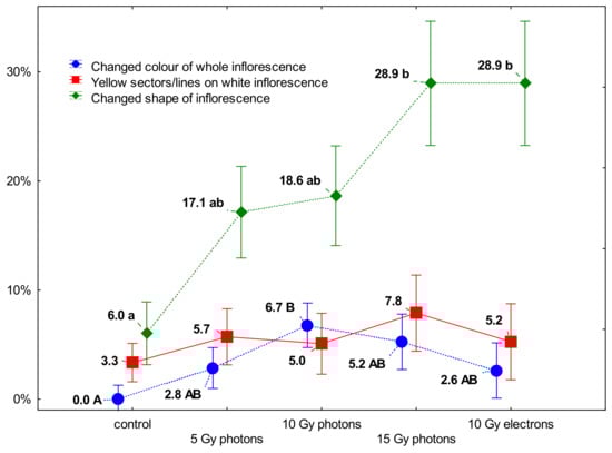 Frequency of variation expressed as the share (%) of particular alternations of inflorescence traits in flowering ‘Profesor Jerzy’ chrysanthemum plants, originated in vitro from explants irradiated with different doses of high-energy photons and high-energy electrons. Means followed by the same letter do not differ significantly at p ≤ 0.05 (upper-case: changed color of the whole inflorescence, lower-case: changed shape), whiskers indicate SE. Results for yellow sectors/lines on inflorescences did not differ significantly.