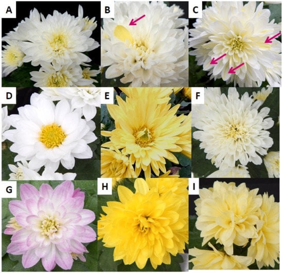 Types and colors of inflorescences of ‘Profesor Jerzy’ obtained in experiment as a result of regeneration from ovaries irradiated with high-energy photons and electrons in various doses. (A) Reference phenotype—white (155 D *), full inflorescence with open, flat ligulate florets. (B) White, full inflorescence with light yellow sector (arrow). (C) White, full inflorescence with multiple yellow lines on ligulate florets (arrows). (D) White, semi-full inflorescence. (E) Light yellow (4 C), semi-full inflorescence. (F) White (155 D), full inflorescence with ligulate florets grown in tubes with ragged endings. (G) Pinkish (69 D), full inflorescence. (H) Dark yellow (RHSCC: 5 A), full inflorescence. (I) Light yellow (4 C), full inflorescence. * Color codes were indicated with the Royal Horticultural Society Color Chart.