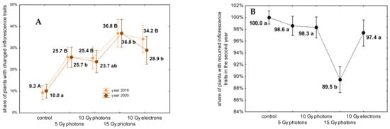 (A): Frequency of variation as an effect of irradiation with high energy-photons and high-energy electrons on the total share (%) of ‘Profesor Jerzy’ plants with changed inflorescence traits (color or shape) in two successive years. Means followed by the same letter do not differ significantly p ≤ 0.05 (upper-case for 2019, lower-case for 2020), whiskers indicate SE. (B): The recurrence of the inflorescences traits in the second year of cultivation expressed as the share (%) of plants flowering both in 2019 and 2020, which recurred their inflorescence traits (color and shape). Means followed by the same letter do not differ significantly at p ≤ 0.05, whiskers indicate SE.