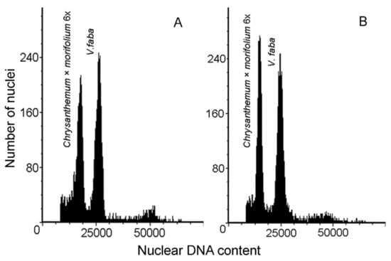 The ploidy level of the studied chrysanthemum samples was estimated by flow cytometry based on genome size analysis. The 2C DNA content was analyzed in young leaves of the reference ‘Profesor Jerzy’ plants (propagated from cuttings in a greenhouse), control (regenerated in vitro from non-irradiated ovaries) and the regenerants originated from irradiated ovaries. The samples were prepared according to the procedure described by Jedrzejczyk and Sliwinska [31], using Galbraith’s buffer (45 mM MgCl2, 30 mM sodium citrate, 20 mM 3-(N-morpholino)propanesulfonic acid and 0.1% (v/v) TritonX-100, pH 7.0; [32]), supplemented with propidium iodide (PI 50 μg/mL), ribonuclease A (RNase A 50 μg/mL) and 2.0% (w/v) antioxidant polyvinylpyrrolidone (PVP-10). For each sample, the genome size was measured in 5000–7000 nuclei using a CyFlow Ploidy Analyser (Sysmex Partec GmbH, Görlitz, Germany) and linear amplification. The histograms were analyzed by the CyFlow Cube program (Sysmex Partec GmbH, Görlitz, Germany). The nuclear DNA content was calculated using linear relationship between the ratio of 2C peak position of chrysanthemum samples and the internal standard (Vicia faba ‘Inovec’; 2C = 26.90 pg; [33]), on the histogram of fluorescence intensities.