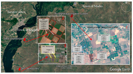Three sites chosen in the reported study area with monitored crops: (1) at the territory of the Privolzhskaya Irrigation System belonging to the ZAO “Volga”; ZAO “Trudovoy”; ZAO “Meliorator”; (2) belonging to the VolzhNIIGiM; (3) belonging to the ZAO “Berezovsky” (source: Google Earth).