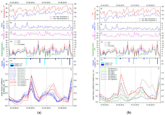 Agrohydrological characteristics of the monitored alfalfa crops over the irrigation period of 2012: (a) ZAO “Trudivoi” and OPX VolzhNiigiM; (b) ZAO”.