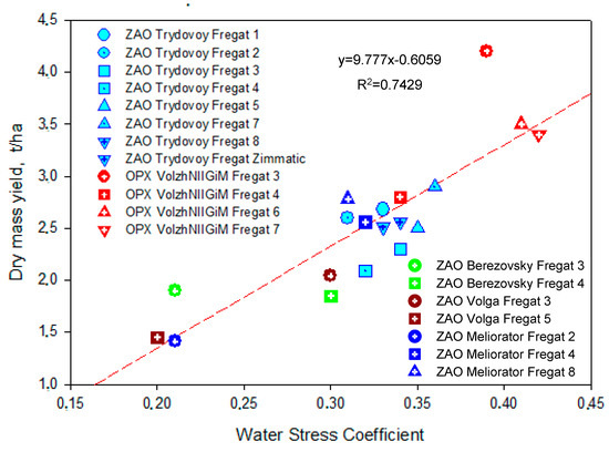 The relationship is expressed as an empirical function in Figure 3. This function was examined for the presence of a linear relationship between the parameters. A slope of a = 9.777, intercept of b = 0.606, and coefficient of determination of R2 = 0.743 were obtained. Thus, the presence of a relationship could be confirmed between the averaged values of the water stress coefficient of irrigated alfalfa crops and their dry mass yield.