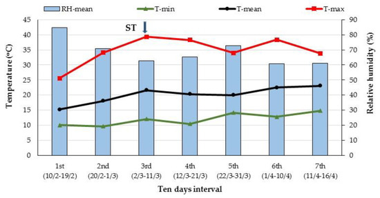 The growing conditions, mean relative humidity (%) and temperatures (minimum, maximum and mean temperature; °C) throughout the experimental period. The left vertical axis presents the temperature mean values and the right vertical axis presents the relative humidity mean values; ST: start of treatments’ application.