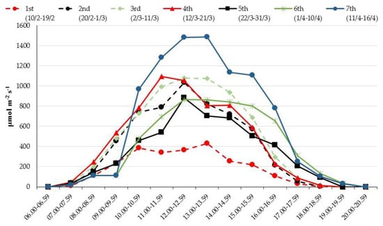 Light intensity (μmol m−2 s−1) within the greenhouse during the experimental period. The values are the means of 10 days’ intervals for hourly recordings.