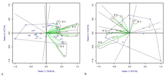 - Yan, W. GGEbiplot—A Windows Application for Graphical Analysis of Multienvironment Trial Data and Other Types of Two-Way Data. Agron. J. 2001, 93, 1111–1118. [Google Scholar] [CrossRef]