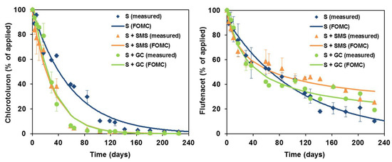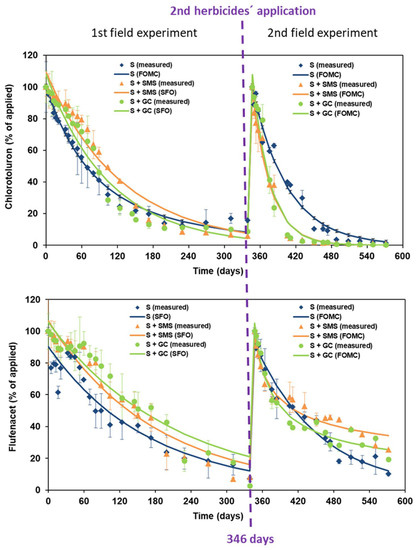 3.2. Comparison of the Dissipation Kinetics of Chlorotoluron and Flufenacet after Repeated Application