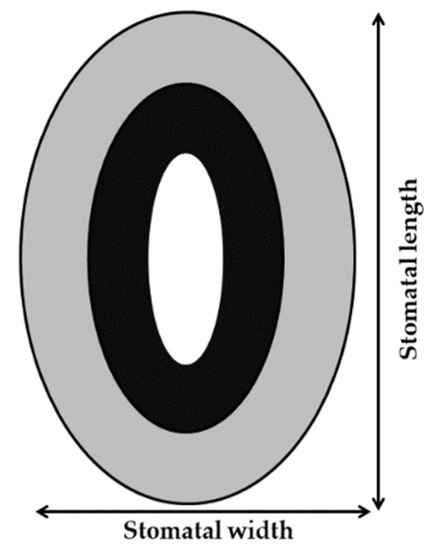 A total of five microscope slides per genotype were observed and photographed using an optical microscope (Motic BA210, equipped with a Motic Cam 3® 3.0 MP camera and Motic Images Plus 2.0 software). From each slide, photographic images of 10 distinct areas of the abaxial leaf side were taken for each genotype. After that, 50 photographs per genotype were analyzed with the Anati Quanti program [31] to quantify the epidermal cell density (ECD; in cells mm−2), stomatal length (SL; at the major axis) and width (SW; at minor axis) in μm (both in Figure 1), and the density (SD); these reflect the number of stomata per unit of leaf area, as well as the stomatal size (stomatal length × stomatal width (SS), stomatal index (SI, calculated as the ratio between stomatal number (NS) and the sum of epidermal cells with NS), and stomatal length/width (SLW; indicative of shape) [32,33,34,35]. The parameters were estimated according to Sack and Buckley [35].