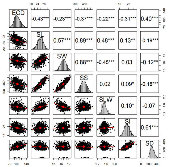 The correlation analysis of ECD, SL, SW, SD, SS, SI, and SLW resulted in 17 significant positive and negative correlations (Figure 3). Correlation values were low, but some were significant: SL × SI (0.13) with p < 0.01; SL × SD (−0.19) with p < 0.001; SW × SD (−0.12) with p < 0.01; SS × SI (0.09) with p < 0.05; SS × SD (−0.18) with p < 0.001; and SLW × SI (0.10) with p < 0.05. Negative correlations were found for ECD, SW, SS, SL, SW, SD, and SS and SD. Positive correlations indicated that an SI increase was accompanied by increases in SL and SS.