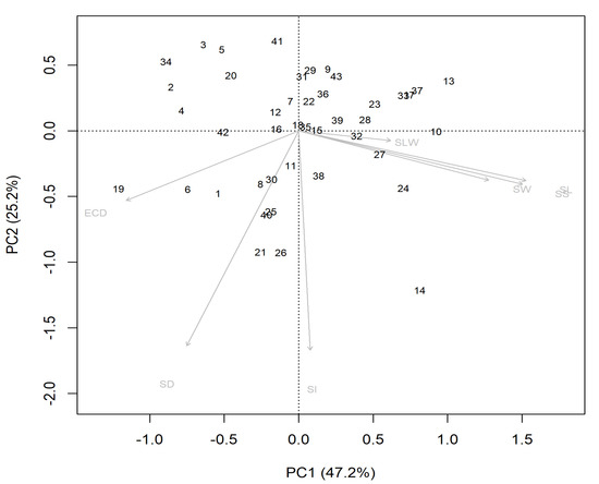 The fifth group was formed only by genotypes 10 and 37, characterized by lower ECD and SD, and the sixth group contained only genotypes 14 and 24, which had the highest SL and SW and the third largest SD.