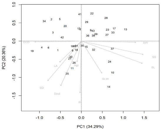 We observed the concentration of the variables regarding ECD, SD, and SI in PC1 negative and PC2. Therefore, SD is highly correlated because of the proximity in the positioning, since ECD and SI remain more distant, almost forming a 90° angle, evidencing a lower degree of correlation. The SLW, SL, SW, and SS traits were arranged in the positive quadrants of PC1 and PC2. It can be observed that the latter three factors are very close, evidencing a strong relationship, since the estimates of SLW and SS are based on the linear measurements of the stomata.