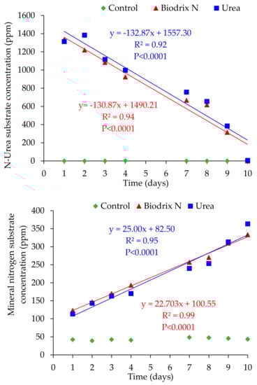 Relationships between mineral nitrogen substrate concentration and time (days) for Biodrix N, Urea, and control.