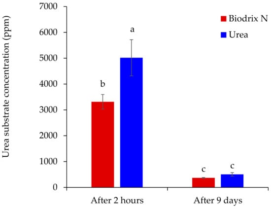 Urea substrate concentrations (mean ± standard error; n = 3) for the two treatments Biodrix N and Urea after 2 h and 9 days. The same letter indicates non-significant differences between treatments according to a Tukey’s test at α = 0.05.
