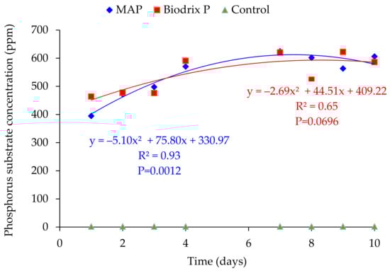 Relationships between phosphorus substrate concentration and time (days) for Biodrix P, MAP, and control.