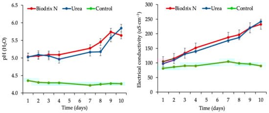 Effect of nitrogen fertilizers (Urea, Biodrix N) on the pH(H2O) and the electrical conductivity of the substrate. Error bars represent standard errors.
