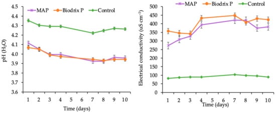 The release of nitrogen by Biodrix N and Urea led to a significant increase (p < 0.0001) in pH and electrical conductivity (EC) of the peat substrate when compared with the control (pH(H2O) of 5.0 vs. 4.3; EC of 100 vs. 80 µS cm−1, respectively; Figure 5). In addition, the change in pH and electrical conductivity in the substrate followed a similar trend throughout the study with both fertilizers (Urea and Biodrix N). The pH(H2O) increased from 5.0 to 5.7 (repeated measures ANOVA, p = 0.0549) and the EC from 100 µS cm−1 to 240 µS cm−1 (p = 0.0964) (Figure 5). In contrast to nitrogen, phosphorus significantly decreased pH (pH(H2O) in regards to the control from 4.35 to 4.10; Figure 6). However, the electrical conductivity of the substrate was four times higher in Biodrix P and MAP than in the control treatment (mean EC of 325 vs. 80 µS cm−1). Repeated measurements showed that Biodrix P and MAP had a similar effect on pH (p = 0.3334) and electrical conductivity (p = 0.4247) of the peat-based substrate throughout the experiment (Figure 6).