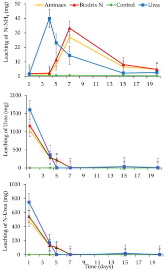 In substrate S2, where compost was added to stimulate microbial activity, the amount of N-NH4 in leached solutions increased continuously in the Urea treatment (Figure 8). On the first sampling day, the amount of N-NH4 was significantly lower (p < 0.0001) with Urea than Biodrix N and Aminaex. The latter reached maximum N-NH4 leaching values on days 4 and 5, respectively, followed by a gradual decrease. Along with this decrease, significantly higher amounts of N-NH4 were observed on days 15 and 20 for Urea. On the other hand, there was no significant difference in terms of cumulative N-NH4 losses after 20 days for all three treatments (p = 0.2038; Table 3). The quantity of N-NO3 in the leached solutions of the Urea treatment was high during the first days, reaching a maximum on day 4. In addition, the difference in leached nitrates between Urea and the two other treatments (Aminaex and Biodrix N) was significant at each sampling day (p < 0.0001). For these last two treatments, the leaching of N-NO3 increased after day 5. However, the cumulative quantity of nitrates leached after 20 days with the Urea treatment was significantly higher than those leached by Aminaex (p = 0.0026) and Biodrix N (p = 0.0004), with 41% and 54%, respectively (Table 3).