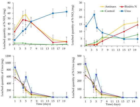 Quantity of N-NH4, N-NO3, Urea, and N-Urea in the leached solution from the peat-vermiculite-compost substrate (S2) according to the treatment and time (days). Error bars represent standard errors.
