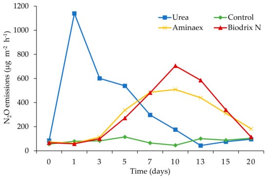 The highest mean N2O flux was observed on the first day in the Urea treatment (1140 µg m−2 h−1), whereas Aminaex (60.5 µg m−2 h−1) and Biodrix N (57.9 µg m−2 h −1) exhibited significantly lower N2O fluxes at that time and did not differ between one another (p = 1.0000; Figure 9). The differences between the mean N2O fluxes of all three fertilizers were significant at each sampling date (p < 0.0001), except for days 0 and 20. The release of N2O by Aminaex and Biodrix N was similar over the course of the 20 days (p = 0.9778), with the maximum N2O flux detected at day 10, ten days later than that observed in the Urea treatment. In addition, this maximum N2O flux from Aminaex and Biodrix N was lower by 55% and 38%, respectively, compared to Urea. On the other hand, although the cumulative N2O flux difference after 20 days was not significant between the three fertilizers (p = 0.1504), Aminaex emitted 8% more N2O than Urea, while Biodrix emitted 17% more than Urea (Table 4).