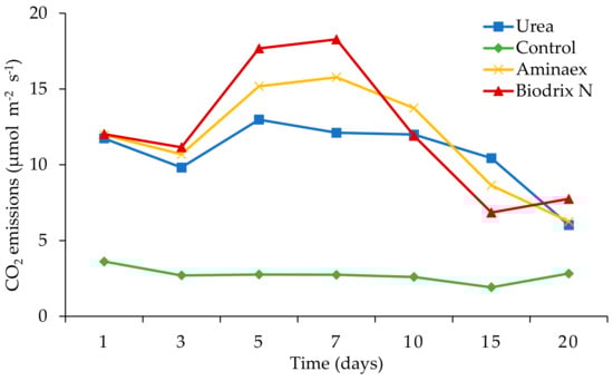 Mean CO2 emissions from fertilized pots were significantly higher than the unfertilized control (p < 0.0001) (Figure 10). In addition, the difference among fertilized pots (Aminaex, Biodrix N, and Urea) was not significant for the entire duration of the experiment (20 days; p = 0.6622). The highest CO2 efflux in the fertilized pots averaged 15.4 µmol CO2 m−2 s−1 and was observed on day 7. On the same day, the CO2 efflux in the control treatment was 2.74 µmol CO2 m−2 s−1.