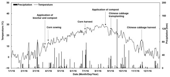 The field experiment was conducted from March 2016 to November 2016 on an upland field (34°56′21″ N, 127°33′53″ E) located at Sepung-ri, Gwangyang-eup, Gwangyang-si, Jeollanam-do, South Korea. The study field cultivated corn and Chinese cabbage through a crop rotation system, where Chinese cabbage was transplanted after corn harvesting. The experimental site experienced a mild oceanic climate with mean annual precipitation of 1615 mm, and a mean temperature of 13.9 °C (Figure 1). This region has a total possible mean sunshine duration of 12.2 h and mean sunshine duration of 5.7 h. The field soil was a sandy loam having a bulk density of 1.30 Mg m−3, pH of 5.31, electrical conductivity (EC) of 0.27 dS m−1, organic matter (OM) of 26.5 g kg−1, TN of 1.74 g kg−1, and CEC of 8.65 cmolc kg−1.
