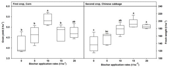 The mean corn grain yields obtained at BC0 (control), BC5, BC10, BC15, and BC20 treatments were 4.15, 4.61, 5.36, 4.70, and 4.73 t ha−1, respectively. Relative to the control treatment, increases in the corn grain yields were 11.2% (BC5), 29.3% (BC10), 13.3% (BC15), and 14.0% (BC20). The fresh weight of Chinese cabbage obtained was highest with BC15 and BC20 treatments; this weight was 33.8–40.0%, 21.3–26.7%, and 4.8–9.5% higher than cabbages grown under BC0, BC5, and BC10 treatment conditions, respectively.