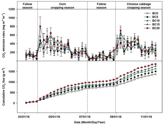 Overall, CO2 emission rates during the sampling period tended to increase with the increasing rate of biochar application. In particular, differences in CO2 emission rates between crop growing and fallow periods were remarkable (Figure 3). Regardless of the biochar application rates, the CO2 emission rate ranged from 50.6 to 803 mg m−2 h−1 during the corn growing period, and 121 to 706 mg m−2 h−1 during the Chinese cabbage growing period. The pattern of the CO2 emission rate for the first crop period for all treatments showed a rapid increase until 7 days after sowing, and a gradual decrease thereafter until corn harvesting. Similarly, for the second crop, the pattern of the CO2 emission rate in all treatments showed a rapid increase until 14 days after transplanting; thereafter, there was a gradual decrease in the CO2 emission until harvesting of the Chinese cabbage. In the growing periods for both corn and Chinese cabbage, the average rates of CO2 emission for the various treatments were 260 and 276 (BC0), 292 and 306 (BC5), 308 and 344 (BC10), 328 and 384 (BC15), and 374 and 367 (BC20) mg m−2 h−1, respectively.