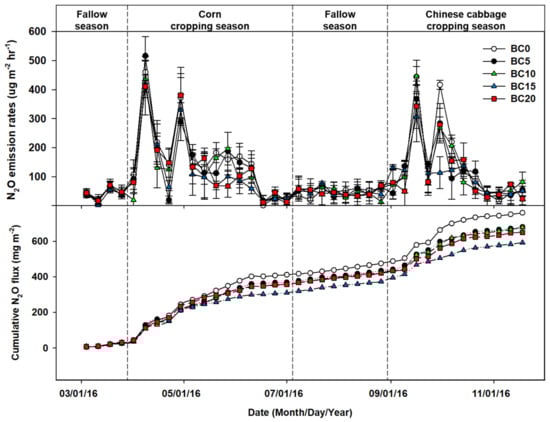 Changes in the N2O emission rate and cumulative N2O flux under different biochar application rates during crop cultivation. Error bars represent standard deviations (n = 3).