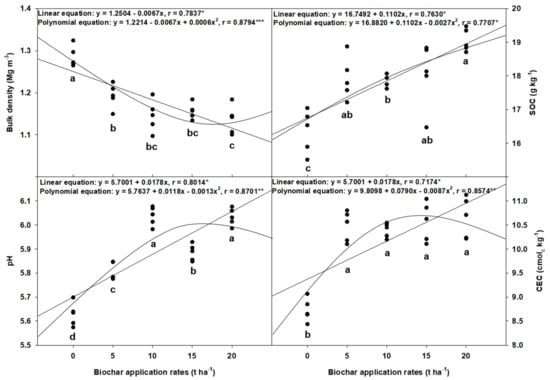 The correlations among each BC treatment level for soil properties are presented based on linear and polynomial equations (Figure 5). The bulk density, pH, and CEC correlations under different biochar application rates and for both types of equations show that the r value of the polynomial equation is greater than the linear equation value; however, the SOC r values were notably not different. Regardless, no significant difference was obtained in the CEC results for different biochar applications.