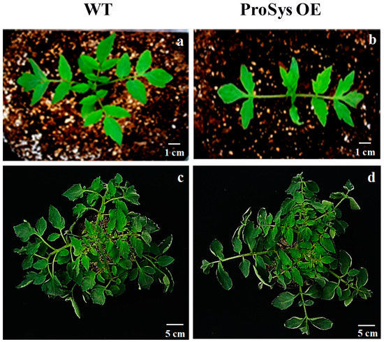 Growth and morphology of prosystemin overexpressing tomato plants. Compared to (a) wild-type (WT) untransformed tomato plants, (b) plants overexpressing the prosystemin (ProSys-OE) precursor of the systemin peptide hormone had a retarded growth at early developing stages (the images show plants 3 days post transplantation (dpt) into pots). In older plants, recorded 33 dpt, (c) WT plants were shorter, had a lower number of leaves and were compacter and morphologically different to (d) ProSys-OE plants.