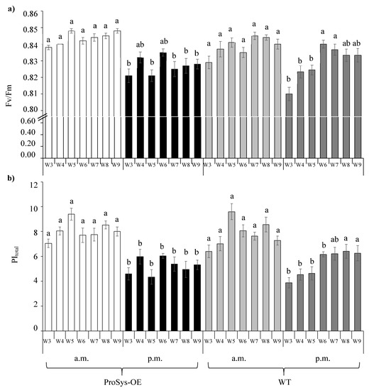 In general, Fv/Fm, PI and total chlorophyll content are unrelated measurements of photosynthetic efficiency. The chlorophyll Fv/Fm fluorescence ratio is an indication of the physiological state of the plants regarding the fitness of the foliar photosynthetic systems. It tests the efficiency of photosystem II in a dark-adapted state [65,66]. As expected, the Fv/Fm ratios tended to be higher and more reproducible when measured in the early morning (Figure 3a). Significant lowering of some Fv/Fm ratios was detected in the afternoon measurements, which were more variable. However, no differences in this parameter were observed between WT and ProSys-OE plants. The same pattern was observed when the PItotal parameter, a reliable indicator of plant vitality, was measured (Figure 3b).