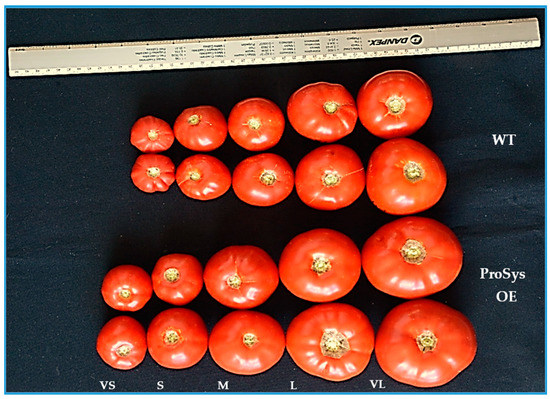 Increased size and weight of fruits produced by prosystemin overexpressing tomato plants. Compared to wild-type (WT) untransformed plants, the overexpression of the prosystemin (ProSys-OE) precursor protein of the systemin peptide hormone, led to the production of larger and heavier fruits. Shown in this image are five fruit sizes (very large (VL), large (L), medium (M), small (S) and very small (VS)) obtained from the second of a total of three harvest lots of WT and ProSys-OE tomato plants.