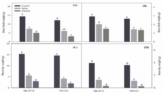 Effect of salinity and alkalinity stress on (A) shoot fresh weight, (B) root fresh weight, (C) shoot dry weight, and (D) root dry weight of 20-day-old maize hybrids (DK-6714 and FH-1231). The bars represent the standard error (±SE) of the four replicates. Similar small letters above bars represent nonsignificant (ns) differences among treatments (p ≤ 0.05).