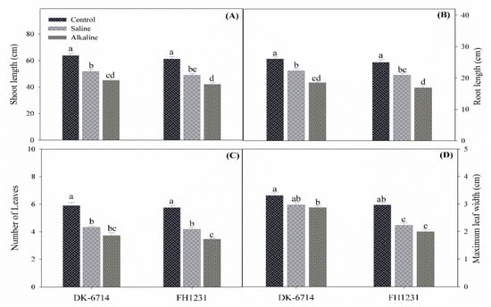 Maize crops are sensitive to high concentrations of neutral and alkaline salts. Increasing crop yields in saline- and alkaline-affected areas is an important task because the increasing amount of salt–alkali soils has reduced the productivity of agricultural land and brought about an ecological crisis to mankind []. The present study examined the morphological, physiological, biochemical, and molecular responses of two maize hybrids to salinity and alkalinity stresses and demonstrated the comparative effects of both stresses on morphological processes and the oxidative metabolism of maize hybrids.