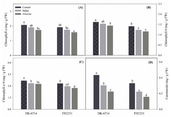In this study, the chlorophyll contents of both hybrids were decreased under salinity and alkalinity stresses, and such reductions were more severe under alkalinity stress. Several authors have reported that salinity and alkalinity stresses increase the activity of chlorophyll-degrading enzymes, thereby reducing total chlorophyll content [,,]. Alkalinity reduces the uptake of Mg2+ ions, which are the building block of chlorophyll and the central atom of the chlorophyll molecule. A decrease in Mg2+ concentration under alkaline stress can lead to the degradation of green pigments []. Moreover, salt-induced oxidative stress affects the structure of the chloroplast and causes the degradation of chlorophyll in plants. This is due to the increase of chlorophyllase enzyme activity, which leads to a decrease in the photosynthetic rate under alkaline stress [,,].