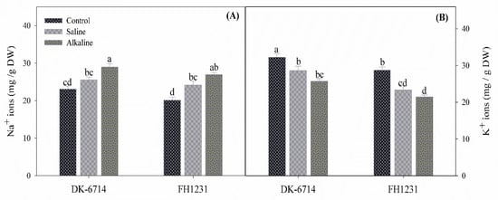 Effect of salinity and alkalinity stress on (A) Na+ ions and (B) K+ ions in 20-day-old maize seedlings of two hybrids (DK-6714 and FH-1231). The bars represent the standard error (SE) of the four replicates. Similar small letters above bars represent nonsignificant (ns) differences among treatments (p ≤ 0.05).