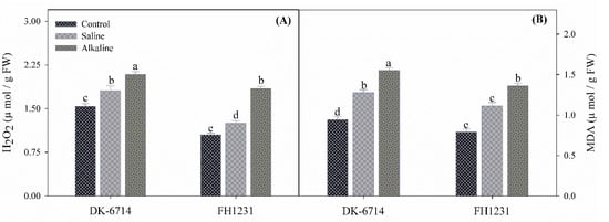 Compared with the control, salinity stress increased the H2O2 content in DK-6714 and FH-1231 by 18% and 19% and the MDA content by 36% and 41%, respectively (Figure 5). Similarly, alkalinity stress increased the H2O2 content by 36% and 76% and the MDA content by 65% and 72% in DK-6714 and FH-1231, respectively, compared to control. FH-1231 recorded higher H2O2 and MDA content than DK-6714 under both salinity and alkalinity stresses (Figure 5).