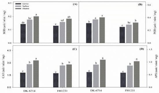 Salt treatments and hybrids significantly affected the activities of antioxidant enzymes (Figure 6). Salinity stress enhanced SOD activity by 25% and 21%, CAT activity by 57% and 54%, POD activity by 19% and 16%, and APX activity by 49% and 47% in DK-6714 and FH-1231, respectively, compared with control. In DK-6714 and FH-1231, alkalinity stress increased SOD activity by 43% and 40%, CAT activity by 81% and 72%, POD activity by 30% and 29%, and APX activity by 82% and 78%, respectively, compared with control. Under both saline and alkaline stress conditions, the hybrid DK-6714 showed higher activities of antioxidant enzymes compared with the FH-1231 hybrid (Figure 6).