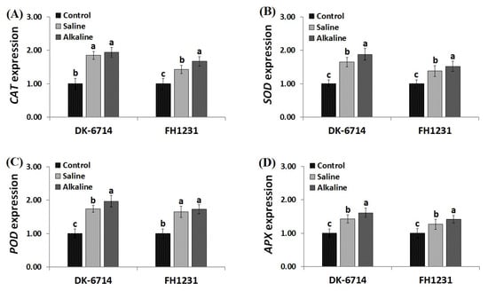 Both salinity and alkalinity stress significantly induced the expression levels of antioxidant genes (Figure 7). Salinity stress induced the expression levels of the CAT gene by 85% and 43%, the SOD gene by 65% and 38%, the POD gene by 74% and 65%, and the APX gene by 43% and 27% in DK-6714 and FH-1231, respectively, compared to control. On the other hand, alkalinity stress enhanced the expression levels of the CAT gene by 94% and 67%, the SOD gene by 88% and 52%, the POD gene by 97% and 73%, and the APX gene by 61% and 72% in DK-6714 and FH-1231, respectively, compared to control. Under saline and alkaline stress conditions, the hybrid DK-6714 showed a higher expression of antioxidant genes than FH-1231 (Figure 7).