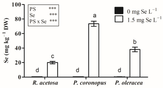 The Se added to the growing medium was taken up and accumulated in the aerial parts of the microgreens (Figure 1). Statistical analysis showed that P. coronopus accumulated the highest amount of Se, which was 92.9% and 265.5% higher than the amount of Se accumulated by P. oleracea and R. acetosa, respectively. The Se content, expressed as mg per kg of fresh weight, of R. acetosa, P. coronopus, and P. oleracea was 1.88, 3.74, and 3.01, respectively. The higher capacity of P. coronopus in accumulating Se could be ascribed to its higher leaves/stem ratio (data not shown), which may have induced higher plant evapotranspiration, and thus a higher transfer of Se from the roots to the shoots via the xylem [46].