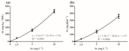 The amount of Se accumulated in microgreens and expressed on a dry weight basis (Figure 2a) or per plant (Figure 2b), was correlated with the Se added to the nutrient solution by a non-linear regression (second-order polynomial quadratic) with a determination coefficient (R2) of 0.9943 (Figure 2a) and 0.9888 (Figure 2b), respectively. This strong correlation means that P. oleracea microgreens could be cultivated with a specific Se content by acting on the Se concentration in the growth medium. A quadratic relationship between the micronutrient concentration in the substrate and in the microgreens was already detected for Zn and Fe in microgreens of arugula, red cabbage, and red mustard [57].