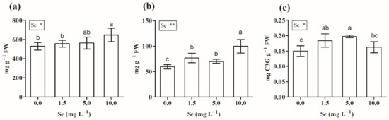 Treatments with 10 mg Se L−1 significantly increased the total chlorophyll (+22.3% compared to the control) (Figure 3a) and the carotenoid (+66.7% compared to the control) contents (Figure 3b). In fact, selenium enhances the biosynthesis of photosynthetic pigments in plants, inducing the repair of chloroplast damage due to abiotic stress and ROS [58,59,60]. An increase in photosynthetic pigments was observed in tatsoi and coriander microgreens treated with 0.63 mg L−1 of Se [23] and in wheat microgreens enriched with 0.5 mg Se L−1 (total chlorophylls) or with 0.125 mg Se L−1 (carotenoids) [19].