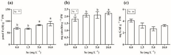 Antioxidant capacity measured by FRAP assay (a), flavonoid (b), and total phenol (c) contents in microgreens of P. oleracea grown indoors under controlled conditions with different concentrations of Se in the substrate. Bars indicated by the same letter are not statistically different for p = 0.05 after Duncan’s test. Significance level: ** p ≤ 0.01; * p ≤ 0.05; ns = not significant.