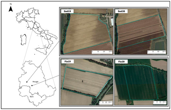 The experiments were carried out over two consecutive cropping seasons (2018–2019 and 2019–2020) in four different fields located in Umbria, Italy (Figure 1). Two of the fields belong to the Fondazione per l’Istruzione Agraria (Fia, i.e., Foundation for Agricultural Education) of the University of Perugia, located near Deruta (Province of Perugia), in the middle Tiber Valley, while the other two cropping fields belong to the Sodalizio San Martino farm (Sod, i.e., Sodality of San Martino), located near Mugnano (Province of Perugia). All relevant field data are reported in Table 1.