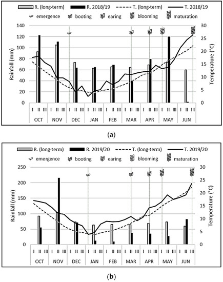 Being an inner region of the Italian peninsula, Umbria is characterized by a humid subtropical climate (Cfa) according to Köppen–Geiger classification [60]. This region differs from a typical Mediterranean area in having quite cold winters (frost may occur several times between December and March) and high annual rainfall (700–800 mm), although late spring and summer are often dry. The cropping season 2018–2019 was unusually mild in winter and rainy in winter and spring (Figure 2a). Conversely, the cropping season 2019–2020 was very rainy in November, which caused the delay of sowing in both the Fia and Sod fields, but then it was mild and very dry in winter and spring (Figure 2b). Weather data was provided by the “FieldLab” of the Research Unit of Agronomy and Field Crops—Department of Agricultural, Food, and Environmental Sciences of the University of Perugia.