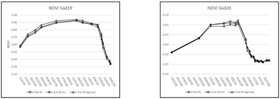 The NDVI data used for the Var-N-dir strategy were based on Sentinel-2 L2A images from 22 March 2019 for Fia19, and from 19 March 2020 for Fia20 (Figure 3). The NDVI data used for the Var-N-inv strategy were based on Sentinel-2 L2A images from 2 March 2019 for Sod19, and from 19 March 2020 for Sod20 (Figure 3). All of these images were cloud-free and the closest to the fertilizer treatments.